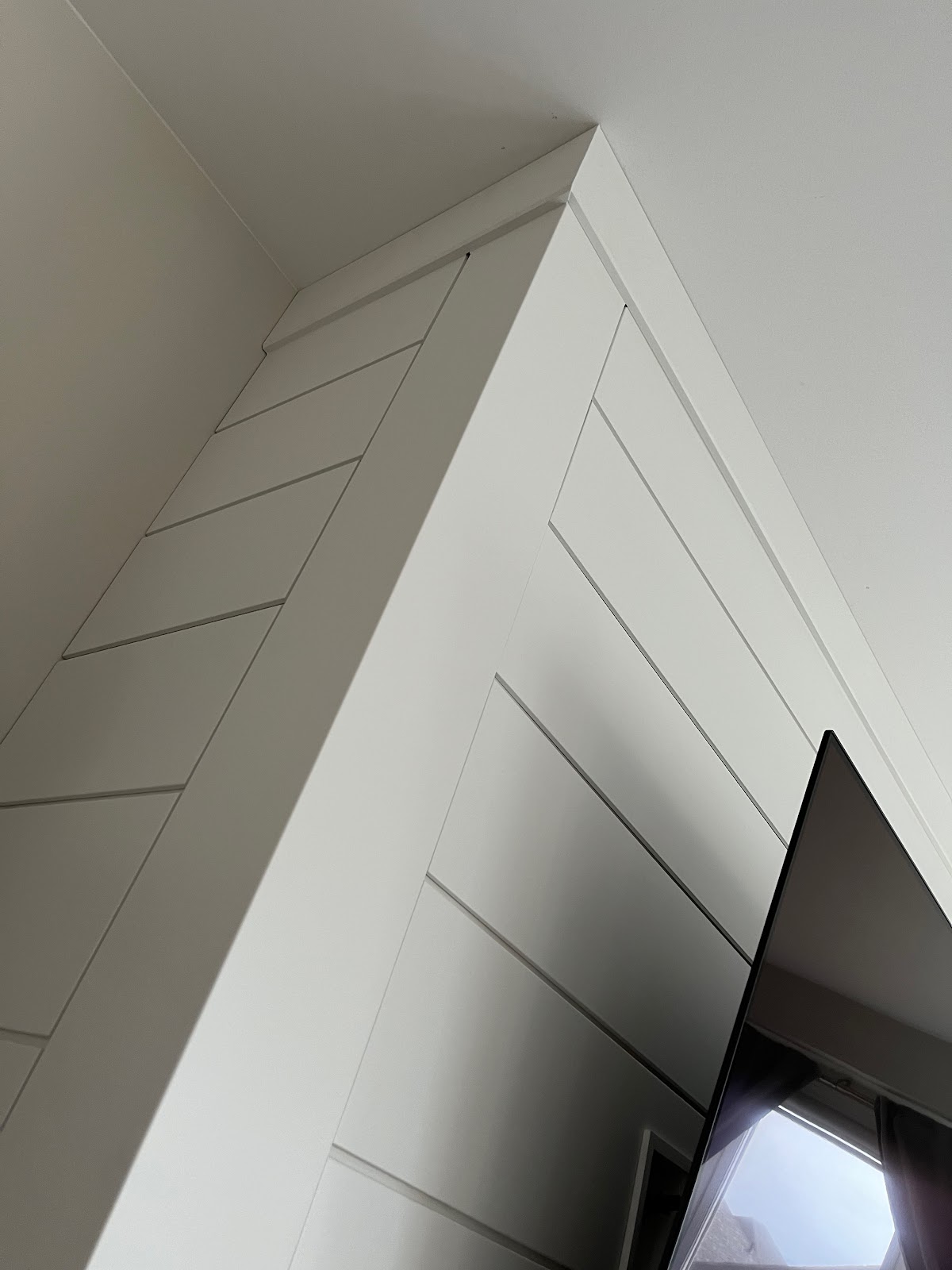 - Shiplap fireplace built onsite with backend electrical wiring.
